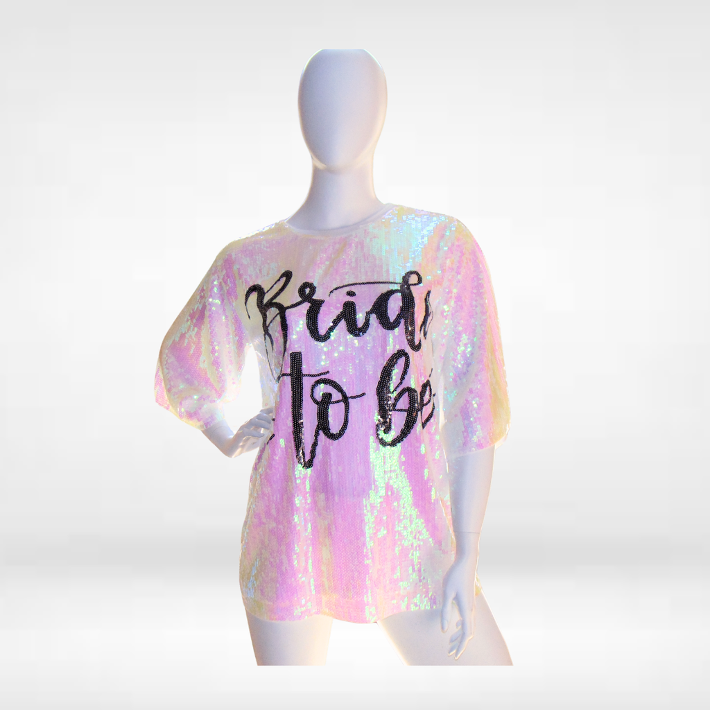 The pink and white metallic reflective sequin shirt displays 'Bride to be.' Perfect for celebrating and making a statement at bridal showers, bachelorette parties, or any special occasion leading up to the big day."