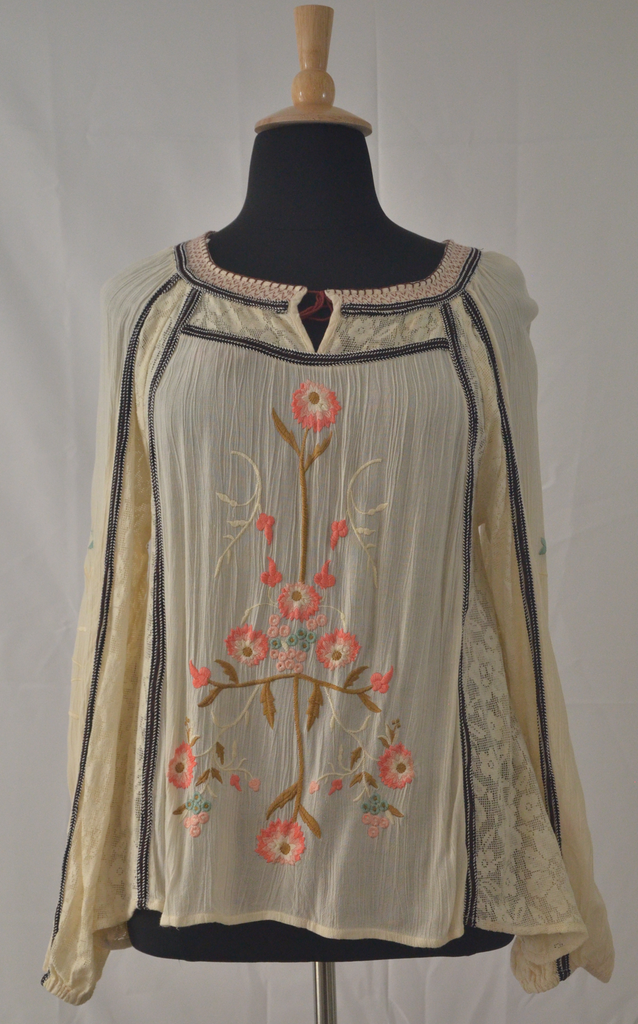 Long Sleeve Sheer Blouse With Emborided Flowers and Laced Sides
