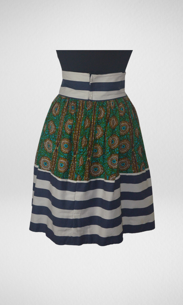 pleated skirt with horizontal striped belt and peacock print on skirt