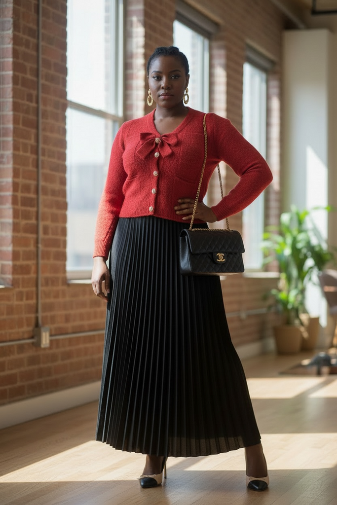Red Chanel cardigan sweater with bow attached and long Black pleated skirt.