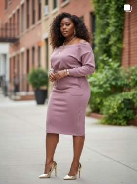Mauve two-piece set featuring an off-the-shoulder long-sleeve top and matching fitted midi skirt with a side slit.