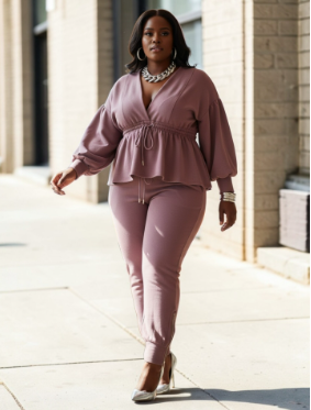 Mauve two-piece set featuring a long-sleeve peplum top with drawstring waist and matching fitted pants