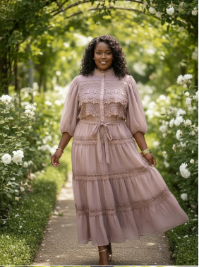 Pink tiered midi dress featuring lace accents and long sleeves. Lightweight and comfortable with a flattering flowy fit. Excellent condition.