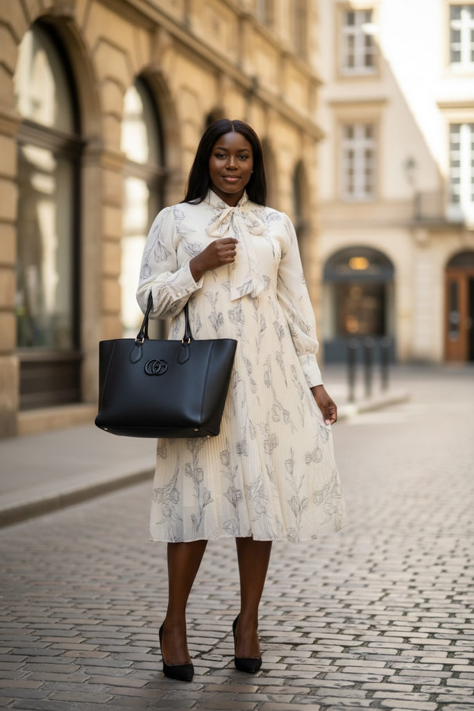 Long-sleeve midi dress in a soft cream tone with an allover subtle floral print. Designed with a high neckline and attached tie detail at the collar. Features a fitted bodice that flows into a gently pleated skirt for added movement. Sleeves are finished with gathered cuffs for a structured look.