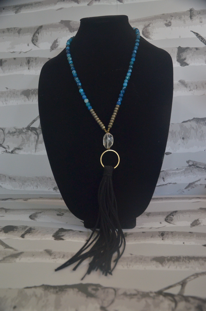 Blue and brown beaded necklace with clear stone and black tassels at the end