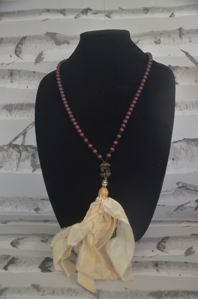Raspberry beaded necklace with peach and white cloth at the end