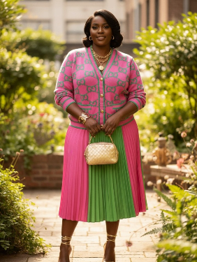 Pink and green colorblock outfit featuring a Gucci patterned long-sleeve cardigan and pleated midi skirt. Soft knit top with button front and a flowy skirt that creates a flattering silhouette