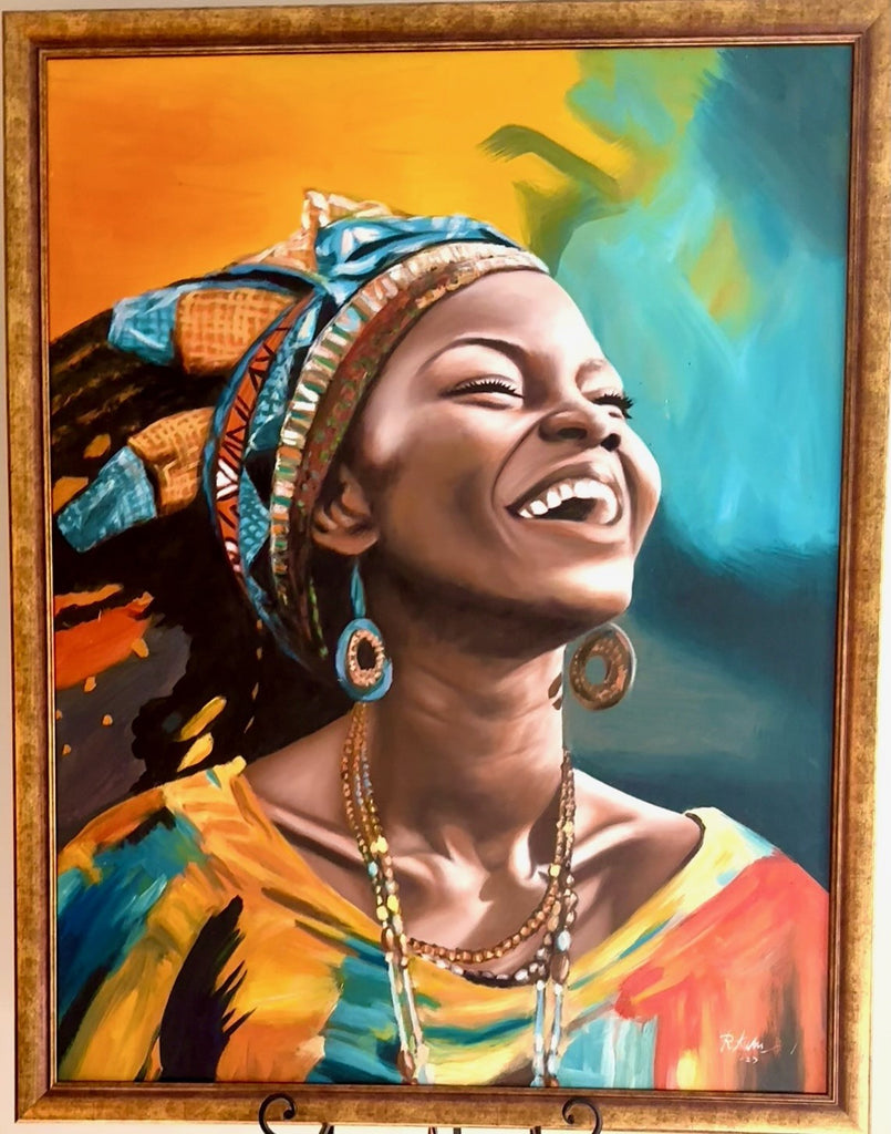 Radiant with joy, a young African woman adorned in tribal headwear beams with laughter in this painting. Warm hues and soft brushstrokes illuminate the scene, evoking a sense of happiness and light."